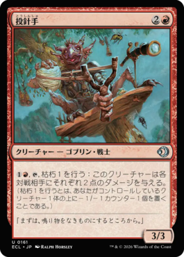 除去耐性能力「護法」を持つゴブリン・邪術師。もし呪文や能力の対象に取られた場合、枯朽2でクリーチャーに−1/−1カウンター2個を置いて、《呪いの悪党、オール婆》の能力でライフを1点失わせることができます。