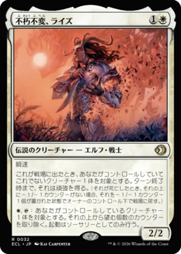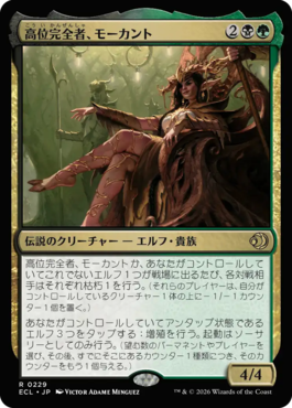 エルフに関連する能力を2つ持つ、ローウィン次元エルフの首領的存在。1つ目の能力では、《高位完全者、モーカント》か他のエルフが戦場に出るたび、各対戦相手に枯朽1を行わせて、クリーチャーを弱体化させることができます。