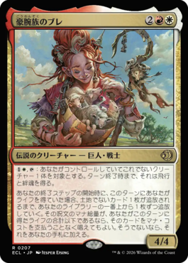 クリーチャーを飛ばして絆魂まで付けられる豪腕巨人クリーチャー。ライフを得ていたら終了ステップに呪文踏み倒しボーナスも発生するので、豪腕で投げ飛ばす用のクリーチャーや、ライフ回復手段は何かしら準備しておきたいですね。