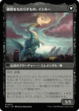 自分のターンに1回だけ変身することができる両面クリーチャー。ローウィン側の《払暁をもたらすもの、エイルドゥ》はクリーチャー・呪文に召集を付与することができます。こちらはクリーチャー・トークンを生成するカードと相性が良さそうですね。そしてシャドームーア側の《黄昏をもたらすもの、イシルー》はクリーチャーに頑強を付与することができます。死亡したクリーチャーを再度戦場に戻せるので、戦場に出たとき能力を持つクリーチャーなどと相性が良さそうです。