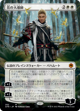 《花の大導師》は白らしいキーワード能力を持たないクリーチャーに戦闘を行わせない妨害能力と、彼を信仰する《素拳のモンク》をサーチするアドバンテージ能力と、2つの起動型能力を武器とする。これらで忠誠度を高めれば、その本来の姿となりて7/7のドラゴンとして暴れ回ってくれる。堅実な働きをしつつ夢もある、基本セットらしい仕上がりだ。