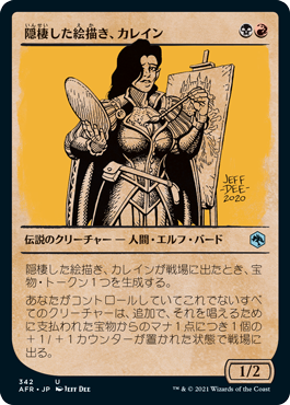 このセットで宝物を主に扱うのは黒赤緑。これらの色には宝物でマナを支払っていることでカードの効果をより高めるものが収録されている。中でも注目は《隠棲した絵描き、カレイン》。
