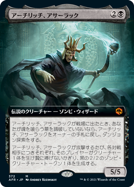 というわけで今週もやってまいりましたクールなデッキを紹介するこのコーナー。今回の主役はこのアサーラック! 大いなるリッチは、「魂を喰らう墓」なるダンジョンを踏破したことがない限りは戦場に出ても手札に戻ってしまう。ただその時にダンジョンを1回探索させてくれるので、彼の陰謀渦まく根城へと一歩踏み込ませてくれる。
