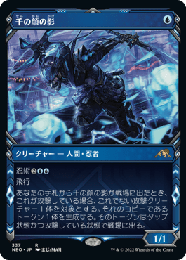 《千の顔の影》は忍術で飛び出た場合、攻撃クリーチャーを1体コピーするという、戦場の頭数が減ってしまう忍術の弱点をこちらもしっかりカバーする能力だ。