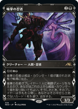 マジックとしても、忍者が持つ能力「忍術」は敵陣に忍び込むための術として再現されている。所定のマナを支払いつつ、攻撃してブロックされなかったクリーチャーを手札に戻すことで行えるアクションであり、結果として攻撃クリーチャーが手札の忍者と入れ替わるというものである。突然目の前のクリーチャーが別のものにドロンと化けるのは忍法チックでもあるが、闇夜を駆ける忍者の特性を上手く表現した能力だと思うね。