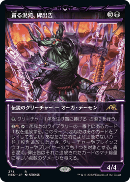 以前は鬼というデーモンを崇める立場だったが、《貪る混沌、碑出告》のタイプを見るに、ついに自分自身がデーモンになってしまったようだ。「全てを貪る混沌の鬼」に自分自身が進化しようというのか……それは《碑出告が全てを貪る》のカード名を見ても明らかなことだな。