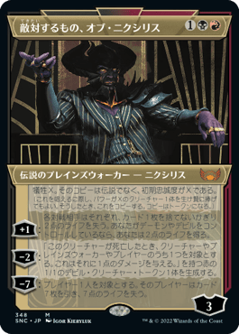 ニクシリスは単騎ではマナ総量相応の、3マナのプレインズウォーカーだなという性能ではあるのだが、唱える際にクリーチャーを生け贄に捧げることでそのコピーも登場。1ターンに2回行動が取れるようになる、ってなニュアンスかな。