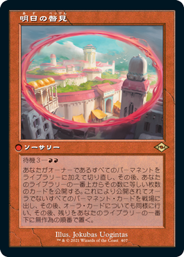 明日というちょっとした未来をチラ見するという名のこのソーサリーは、マナ・コストを持っていない。なので普通に唱えることはできず、待機から唱える形になる。その効果はかつての《歪んだ世界》と似ている。