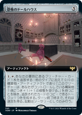 このアーティファクトは墓地のクリーチャーを追放し、それのコピーである構築物を生成する。サイズは0/0だが。構築物の数だけサイズアップするという能力を持つ。最初は1体とまさにちっぽけな人形だが、2体3体とドールハウスに人形が並べば……生きて帰ることは難しくなるな。人形の顔を見ると死んだはずのあのクリーチャーが、というホラーなフレイバーも素晴らしい。