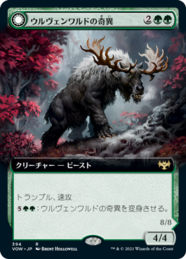 これをつけられているクリーチャーは森の数だけ強化されるという、わかりやすくそして強い能力! 《ウルヴェンワルドの奇異》につければトランプルでガシガシダメージを叩き込めて一瞬で対戦相手をノックアウトできる! というわけで森をずらりと並べるデッキ=緑単を組む理由がやってきたのだ。いや~「緑単アグロ」ユーザーからすると嬉しい限りだね。