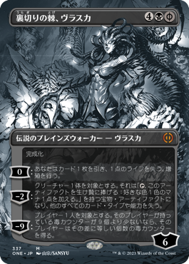 2 《薮打ち》 2 《喉首狙い》 1 《シェオルドレッドの勅令》 3 《絶望招来》 1 《ギックスの命令》 4 《八百長試合》 2 《裏切りの棘、ヴラスカ》 2 《向上した精霊信者、ニッサ》 -呪文(17)- |