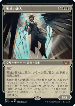 《聖域の番人》はトークンも並べることで《絶望招来》1枚で処理しきれないし、盾カウンターで《喉首狙い》などでも簡単に処理しきれないという、6マナ支払う価値ありのタフさがたまらない。5/5飛行と攻撃させても一流で、かつドローも狙えると隙がない。さらに《鋼の熾天使》はキーワード能力を付与、とくに絆魂でのライフ回復で攻めのデッキの心をへし折る。終盤に6マナで唱えて良し、早いターンであれば試作で3マナ3/3として運用して良しで手札のお荷物になりにくいのが嬉しい1枚である。