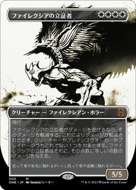 5/5飛行となると、《ファイレクシアの立証者》がこのデッキの象徴と言えるね。シンボルが4つも並んだ単色専用カードだけあって、4マナでサイズも回避も併せ持った打線の中心・4番バッターだ。ダメージを受ける際にそれを全て軽減するという、非常に高い除去耐性・ブロックを恐れずに殴りに行ける硬さを誇る。ただそれだけでなく、軽減したダメージ分を任意の対象に与えるので、対戦相手のライフ本体に飛ばせるというのが大いにプレッシャーをかける。ダメージでクリーチャーを除去する、特に赤にとっては悪夢のような存在。適当にブロックしてしのいだり相討ちしようにも……という詰みの状況に持っていく、高いカードパワーでゴリ押しする1枚だ。