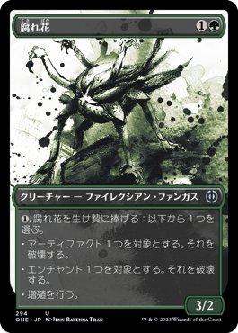 《グリッサ・サンスレイヤー》は攻撃を通すと3つのモードから一つ選択。概ねドローを選んで手札を補充しに行くことになるが、状況によってエンチャントが破壊できたり、プレイヤーを攻撃しつつプレインズウォーカーの忠誠度を減らしたりとアドリブが効くのはこれぞ緑の真骨頂。同じくエンチャント破壊が可能な《腐れ花》はアーティファクトにも対処できて、さらに増殖でこちらのプレインズウォーカーの忠誠度を増やしたり《シェオルドレッド》変身後の《真実の経典》の能力をインスタントタイミングで一つ進めたりと、予測不能なムーブをかましてくる小粒でもピリリと刺激的な1枚。さらにメインとサイドに採られた《温厚な襞背》はこれまたエンチャントorアーティファクト破壊に加え、墓地対策にライフ回復にとコンボやアグロにも強い!しかもモード3つとも誘発も狙える!というかなりのやり手。