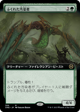 定番の白緑に青が加わっているのがこのリストの特徴。打ち消しやバウンスなど、青ならではの撹乱要素で対戦相手により干渉できるデッキを目指してという意味合いもあるが……最大の狙いは《渦巻く霧の行進》。対戦相手のクリーチャーを対象にして一時的に除去して攻撃をねじ込む、あるいは自身のクリーチャーを除去から守るための手段として応用の効くX呪文。その真価を発揮するのは《敬慕される腐敗僧》とのコンボ!自身のクリーチャーを更新1枚で複数体対象に取れるので、腐敗僧の能力を多数誘発させて対戦相手に毒を直接乗せまくり!アグロに仕込まれたコンボ、二段構えに隙は無い!