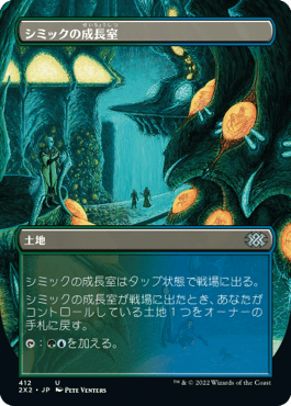 ③緑1マナを残して《原始のタイタン》を唱え、その能力から《セレズニアの聖域》《シミックの成長室》を戦場へ。各々が護符で2回アンタップ、マナの合計は緑5白2青2。