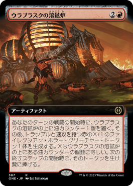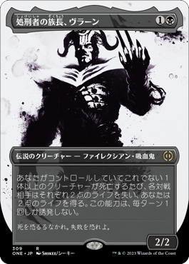 詳しくは以前に紹介したコラムを読んでもらえると助かります!なので、ここではザックリと。クリーチャーが死亡すると対戦相手のライフを2点吸える《処刑者の族長、ヴラーン》を添えて、《ウラブラスクの溶鉱炉》が供給するファイレクシアンを毎ターン《ふくれた昇華者》などで生け贄に捧げ続ける。そうすると対戦相手のライフを確実に詰めていける……ド派手なムーブではないが、こういう真綿で首を締める系のムーブ、好きな人もいるだろう。僕は……大好きなんだな、これが。