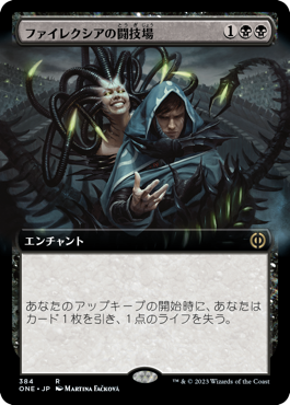 あとエンチャントでいえば《ファイレクシアの闘技場》との組み合わせも失念してはいけない。毎ターン1点のライフと引き換えに1ドローを提供してくれる闘技場。アドバンテージの観点で考えれば、ライフが手札になることは喜ばしいことで可能であればどんどん進んでやるべきことだ。