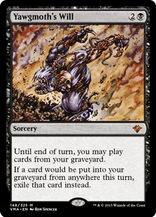 先にも挙げたようにヴィンテージでは形で過去のとんでもないカードや、あるいは《思案》のような軽いドロー及びサーチ呪文が制限カードとなっている。1枚、つまり1回こっきり。《ブラック・ロータス》は生け贄に捧げて3マナ加え、《Ancestral Recall》を使い捨てることで3枚ドローできる。《ヨーグモスの意志》はこの前提を崩壊させる。一度使ったロータスを拾ってまた3マナ、Recallで3ドローおかわり、こんなのなんでもありすぎるだろと。強いものは1回で満足するな!ヨーグモスの強い意志がうったえかけてくる。これが唱えたくてヴィンテージを続けている方もいらっしゃるに違いない。