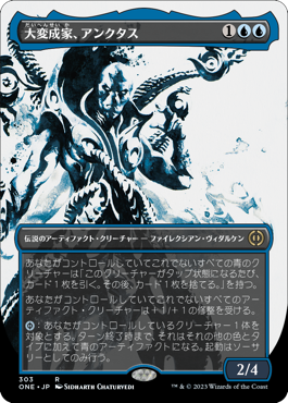 ローナのドローを倍速にする《大変成家、アンクタス》。これの能力はローナや他の青のクリーチャーを《伝説の秘宝》によりタップした際にも誘発する。これにさらに《苛まれし預言者、エルス》が絡められると……青いクリーチャーがタップする度にライブラリーの上から2枚が追放され、それを唱えられるようになる。手札が空になっても2枚ずつプレイ可能なカードが増えていくので、これらを秘宝ローナのマナで唱え、アンタップしたローナと戦場に出た伝説のクリーチャーをタップしてマナを得て、アンクタス×エルスで獲得したカードを唱えて……とループを形成。この際に《復興の領事、ピア・ナラー》が出せているとモリモリと飛行機械が生成され、これらはアンクタスで+1/+1修正を受けている。一気に殴ってフィニッシュ!対戦相手はこちらが何をしてくるのかわからないことが多いため、まさかこのターンにゲームが終わるとは思っていないかのように見えた。いわゆる「わからん殺し」。気持ち良いやつだな。