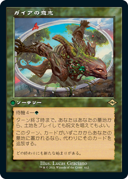 《鏡に願いを》!これも2023年にクールなデビューを果たした1枚。このデッキはマナ加速のために《金属モックス》を採用、そして土地の枠には《囁きの大霊堂》もあり、これらを生け贄に捧げて協約している状態で《鏡に願いを》を唱えられる。4マナ以下の呪文をサーチしてきてそのコストを支払わずに唱えられるので……コストを持たない《ガイアの意志》や《死せる生》が唱えられるッ!
