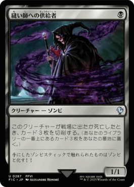 そんなクリーチャーの中でも《ドラゴンの怒りの媒介者》はエース格。条件を満たしての3/3飛行というスペックも素晴らしいが、何より諜報能力で墓地をモリモリと肥やせるのが素晴らしい。その墓地耕しの方向に特化した1枚が《縫い師への供給者》。切削により墓地が3枚増えるのは、脱出1回分のカードを得るということと同義である。相手のクリーチャーを受け止めても、あるいは除去を使わせても切削で墓地が増えるので、対戦相手からすると嫌がらせポイントが非常に高い。そしてこの供給者を《悪魔の意図》で生け贄に捧げるという動きが最もスマートかつクールで、対戦相手がこの動きをしてきたら「クライマックスだな……」と背筋に汗が伝う。