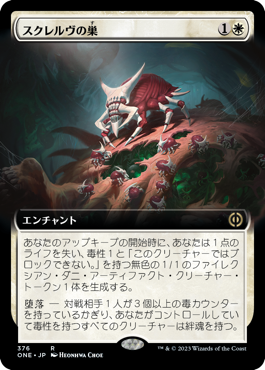 警戒能力を与える動きはきわどいダメージレースを行っている際には特に頼もしい。さらにこの毒性デッキであれば《離反ダニ、スクレルヴ》で攻撃しつつ、このダニの能力を起動するという独特のムーブも披露可能になる。錚々狙う場面はないかもしれないが、1点のダメージ・1個の毒が戦況を分けるような状況下であればこの動きができることを思い出してみてほしい。スクレルヴの能力は対象のクリーチャーに色に対する除去耐性及び回避能力を与えるとともに、実は毒性も与える。なので、トロスターニがデッキ内で浮いた存在にならずに毒を与えにいくことも可能にしてくれるのだ。