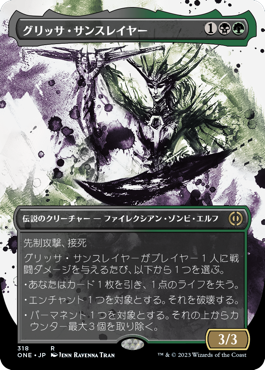 新カード《腐食の荒馬》はゴルガリの2マナ圏として定着している。普通に攻撃しても十分に強い。ライブラリーの一番上のカードが手札に加えられ、対価としてライフを失う。当然のやり取りではあるが、この荒馬に騎乗できればライフは対戦相手が失ってくれる。手札が増えて相手も弱る、どういうこと?と疑ってしまうレベルの恩恵をゴルガリなら難なく受けられるのだ。なにせ同じ2マナの戦慄騎士がパワー3で、騎乗の条件を満たせるからね。攻撃するとカードを1枚引ける《分派の説教者》、攻撃が通るとカードを1枚引くモードを持つ《グリッサ・サンスレイヤー》とゴルガリの定番ラインナップらで、攻撃しつつも手札を増やす。至福のゲーム体験を味わおう!