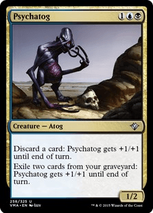 青と黒、2色のクリーチャーである《超能力蛙》。このカエルは手札を捨てると+1/+1カウンターを得るという起動型能力を持つ。また墓地を3枚追放すれば飛行も持つ、ビヨーーンと大ジャンプってことだな。この色と手札&墓地を消費してパワーアップするというところが、往年の名カード《サイカトグ》を思い起こさせる。こいつ、初出当時は本当に強いカードだったんだよなぁ……当時より20年以上時を経てクリーチャーの質は全体的に大幅向上。今のマジックで《サイカトグ》が活躍するにはカードパワーが足らないが……カウンターという永続的な強化に切り替わり、さらには戦闘ダメージをプレイヤーかプレインズウォーカーに与えれば、カードが1枚引ける!このドローというダイレクトなアドバンテージ、単純に強い上に自身の能力のコストになってくれるという自己完結っぷり。サイカを使っていた世代も、知らない世代も、このカエルを使ったデッキを遊んでみてほしいものだ。たとえば、手札を捨てることにフォーカスしてこんなデッキとか……