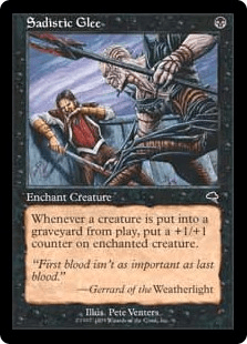 サディストは対戦相手のクリーチャーはもちろん、自身のクリーチャーが死亡しても誘発する。つまり、落とし子を生け贄=死亡させることで、繁殖鱗にカウンターが置かれ、それにより落とし子が生成されそれをまた生け贄に……と、2枚のカードで無色マナを無限に加え、繁殖鱗のサイズも無限にパンプアップさせることが可能だ。お手軽に無限コンボが達成できる!これだけでも現在のパウパーがいかにエキサイティングでクールなものかが伝わるかと思う。