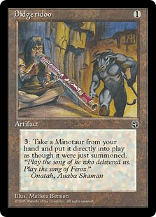 いやいや、マジックにもあんのよディジュリドゥが。その名もまんま《Didgeridoo》!確かにイラストにはこれぞディジュリドゥという笛を吹く人物が描かれている……そして奥からはこちらにやってくるミノタウルスの姿も。このイラストはまんまこのカードの効能を表しており、このアーティファクトは{3}を支払うことで手札のミノタウルスを戦場に出すことができる。