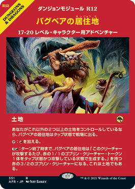 《ラムナプの遺跡》《反逆のるつぼ、霜剣山》と赤いデッキの嗜みに加えて、《変わり谷》と《バグベアの居住地》をそれぞれ4枚積み!全力の姿勢だ。何せこれらの土地はクリーチャーになるという点だけでも素晴らしいのに、それぞれゴブリンになるのがクールすぎる。バグベアにいたってはゴブリン・トークンも生成するので頭数も増えるという、至高の1枚である。クールであるがゆえに3ターン目以降だと扱いにくい弱点を持ったバグベアだが、そんなことを恐れてどうすると堂々のフル投入だ。2枚までは初手に来ても大丈夫、タップインになってもそれはそれで手札のゴブリン次第では許容できたりもする。デッキの種族とマッチしたカードは、多少都合の悪いテキストには目をつぶって運用するという開き直りもまたクールな作法というもんだ。