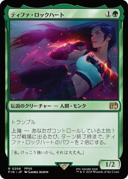 この原稿を書いている時点ではまだプレビューが始まって全カードが公開される前のタイミング。なので緑単に加わる新戦力はこれ!と言い切れないが、軽量クリーチャーには《サッズのヒナチョコボ》《ティファ・ロックハート》といったカードが見られる。どちらも土地を戦場に出すことで打点が上昇するクリーチャーなので、その上陸の条件を満たせるカードと組み合わせて遊んでみたくなる。幸い土地を戦場に出すのは緑のお家芸なので、選択肢には困らないだろう。