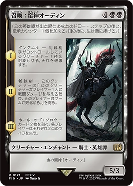 《召喚:蛮神オーディン》!ビジュアルが最高にイカす、定番の召喚獣。これは戦場に出るとクリーチャー除去、去り際には2枚の手札を残していくなど堅実にアドバンテージをもたらしてくれる。が、中でも注目すべきはⅡ能力。これが誘発したターンにオーディンの攻撃が対戦相手に通ると、ダメージ量や残ライフ云々に関わらず一撃で敗北をもたらしてしまう。一種の勝利条件カードであり、思わず狙ってみたくなる。ズアーvsズアーのミラーマッチなどはお互いのデッキの強固さから、ゲームが以上に長引くことがある。オーディンの斬鉄剣を叩き込めればその瞬間にゲームが終わる!これがあるかないかは大きな違いだ。
