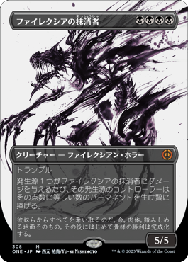 クリーチャーに目をやると《ファイレクシアの抹消者》の姿が。5/5トランプルというボディに、ダメージを受けるとそれのコントローラーに同じ値のパーマネントの生け贄を要求するという、無慈悲な暗黒ファイレクシアンだ。この抹消者のえげつない能力を無理やり誘発させて対戦相手のパーマネントを消し飛ばすため、格闘を行う《薮打ち》が採用されている。黒緑系のデッキで一時期流行った組み合わせで、クリーチャーデッキ相手にこのコンボが決まればゲームの流れは決定的なものとなる。またこの《薮打ち》での格闘はセシルとの組み合わせもクール。接死で確実に討ち取り、あんこく誘発でライフを減らして変身を目指したり、パラディンセシルと格闘させて絆魂で回復したり……《狩人の才能》もパワー分のダメージをクリーチャーが与える除去なので、セシルから接死or絆魂の一撃を叩き込もう。