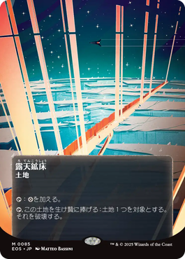 個人的に気になるカードは《露天鉱床》!マジック最初期のカードらしい、ぶっ壊れ性能の持ち主だ。この土地をタップして生け贄に捧げるだけで土地を破壊!しかも対象は……なんでもOK!《不毛の大地》のように基本土地に対しての情なども持ち合わせておらず、問答無用で叩き割る。特に自らクリーチャーを仕掛ける早いデッキや、墓地利用する類のコントロールで用いることで、対戦相手をマナが少ない状態に抑え込んでボコボコに…あまりにも強すぎるため、各種フォーマットで禁止や制限を受けている。現在通常の構築戦ではヴィンテージでのみ使用可能で、1枚制限となっている。