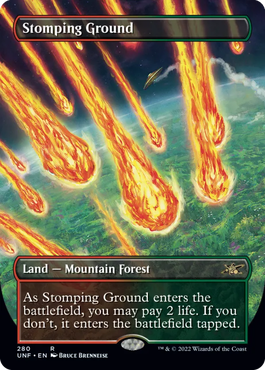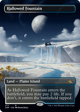 そんなショックランド、ラヴニカではなく宇宙をテーマにした『久遠の終端』に再録されることに違和感を持った人もいるかもしれない。でも僕個人としては、すんなり理解できた……なぜなら『Unfinity』にて宇宙アートのショックランドが既にリリースされているからだ。宇宙のどこかの惑星や宇宙空間そのものなど、SF色の強いロケーションが描かれたフルアートのこれらのショックランド。必ずどこかに宇宙船が描かれているという遊び心もあって、人気の高いカードだ。MTGアリーナでもこれのスタイルが過去に発売され、ショックランドはこの仕様をここ数年用いてきた自分としては……むしろショックランド=宇宙の方がしっくりくると言っても過言ではなかった。