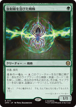 そして《スパイダーパンク》とスパイダーハムを手札に加えられる《放射線を浴びた蜘蛛》!スパイダーマンというシリーズの始まりを告げるこの蜘蛛は、生け贄に捧げて蜘蛛・英雄を探すことができる。貴重な1マナ域の蜘蛛でもあり、接死&到達でこれ自体が対戦相手にとって鬱陶しい存在にもなる。これらのカードを組み合わせて、グルール(赤緑)カラーの蜘蛛デッキのサンプルを作ってみた。