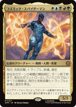 《コズミック・スパイダーマン》を知っているマジックプレイヤーは全体の何パーセントくらいかな。この5色の蜘蛛・人間・英雄は飛行・先制攻撃・トランプル・絆魂・速攻と5色らしく各色を思わせるキーワード能力を持つ。ライフレースをこれ1枚でひっくり返せるポテンシャルがあり、さらに自分のターンの間に全ての蜘蛛にこれらの能力を持たせるという、ド派手は支援も行う。他に2、3体蜘蛛がいる状況で《コズミック・スパイダーマン》を出せれば即座にゲームエンド級のパワフルな1枚である。