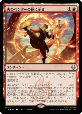 そしてこのエンチャント、トークンを作った後はクリーチャーの攻撃により能力が誘発する度に探索カウンターが乗る。4つ以上乗れば、誘発型能力をコピーするようになる。デルニーと同じくこれが強いッ!火の技も2マナ加えるようになれば、上記のカード達の能力起動もスムーズに。《火のベンダーの位に至る》と火の技やその他の誘発の組み合わせ、本当にすごいことができてかなり気持ち良いので、今後スタンダードで流行る可能性大アリだ。