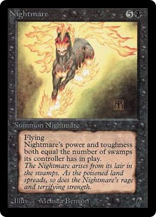 そもそも《夢魔》が馬の姿で描かれているのには理由がある。ナイトメア……悪夢を意味する英単語の綴りはNightmare。一方雌馬を意味する英単語はmareであり、ナイトメアにこれが含まれている。何故夜+雌馬で悪夢を意味するようになったのかは……調べてみたがかなり諸説あるようで……mareは怪物のニュアンスのラテン語がどうとかで、直接雌馬が関係しているわけではないのかもしれない。マジックではこの《夢魔》をはじめ、《サンダーメア》《ティンバーメア》など様々な要素を体現する馬のカードをファンタジックな世界観を拡げているというわけである。
