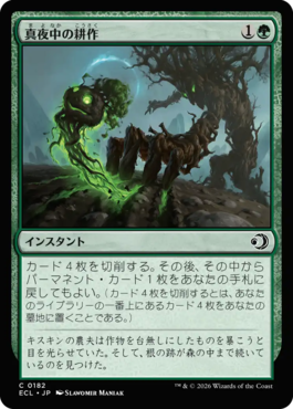 同じセットに新カードでこれらに該当するカード探してみると……《真夜中の耕作》のように切削を行うカードは多く用意されており、これらでゴリゴリと掘り進んで《月影》を育てるというのも楽しいだろう。また想起という軽いコストで唱えられる代わりに、戦場に出た後に生け贄となってしまうエレメンタル達も、自動的に《月影》の条件を満たすことができる。こういったカードを固めたデッキを構築すれば、《月影》を毎ターンめきめきと育てて対戦相手を圧倒できるデッキに仕上がるはず!