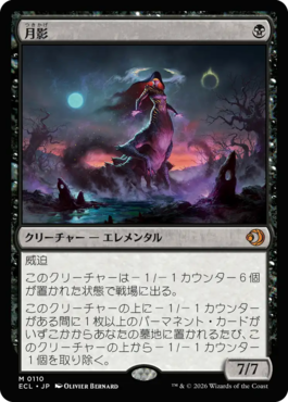『ローウィンの昏明』……刺激的なカードが多くないか?プレビューの時点で強そうに見えるカードがゾロゾロと……2026年のトップバッターを担うセットとして、期待が高まるというものだ。カードのビジュアル、名前、デザイン……あらゆる面で筆者がビビっときたカードの1つが《月影》!こんなシンプルな名前のカード、今までなかったんだなという意外性、そしてグロテスクであり美しいイラストが強く印象に残る。1マナ7/7というぶっ飛んだスペックも、思わずプレイしたくなるというものだ。