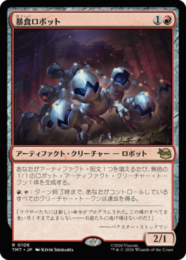 《再利用隔室》といえば《大いなる脳ミソ、クランゲ》を生け贄に《ユートロムの武人、クランゲ》で暴れてみたい!この重すぎるアーティファクト・クリーチャーを出撃させるには8マナのクランゲを足掛かりにするのがスマートだろう。また《暴食ロボット》はクランゲとは対照的に唱えやすい2マナと軽く、アーティファクトを唱えることでジャラジャラとロボットを生成……これをメインテーマにした軽量アーティファクトデッキというコンセプトも面白そうだ。
