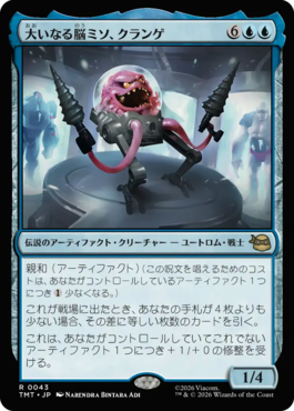 また《大いなる脳ミソ、クランゲ》はアーティファクトの数だけコストが軽減される親和能力を持ち、それの数だけパワーも上昇。されに戦場に出た時に手札が4枚になるようにドローももたらしてくれる。テクノロジーを駆使する悪役に相応しい、アーティファクト要素たっぷりのクリーチャーに仕上げられている。