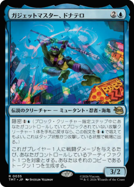 タートルズは4人の亀の兄弟が主人公。レオナルド、ドナテロ、ラファエロ、ミケランジェロ……ルネサンスを代表する巨匠の名を付けられた兄弟はそれぞれに全く異なるパーソナリティを有しており、このセットでもそれがカードデザインに落とし込まれている。紫のハチマキを付け棒を武器とするドナテロは、機械いじりに関して天才的な頭脳を誇り、タートルズたちが用いる様々なガジェットを作成。その才能はアーティファクトに関するカード達で表現されている。