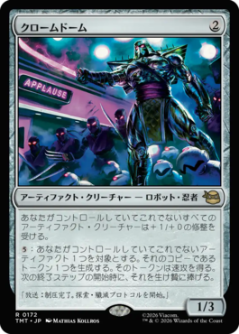またタートルズと敵対するワルモノ達もアーティファクトを参照するカードを担当している。《クロームドーム》はアーティファクト・クリーチャーのパワーを上昇させ、またアーティファクトのコピーを生成可能。一時的にしか戦場に存在しないが速攻を与えるため、クリーチャーをコピーして突撃させるという使い方を想定している。本体が{2}と軽いコストなのが素晴らしい。