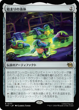 《大いなる脳ミソ、クランゲ》を中心に、《ミュータントの機械工、ドナテロ》などの新カードを少しずつ投入。《再利用隔室》で《クロームドーム》や《暴食ロボット》などを持ってこられるように1マナのアーティファクトも用意。これらのクリーチャーは構築物をコピーして速攻を持たせたり、トークンにまとめて速攻を与えることでフィニッシュに導く手段となる。《始まりの液体》は墓地利用系デッキへの対策として、そしてアーティファクトのカウントを増やせるため、ゲーム終盤の構築物のサイズアップに貢献してくれる。