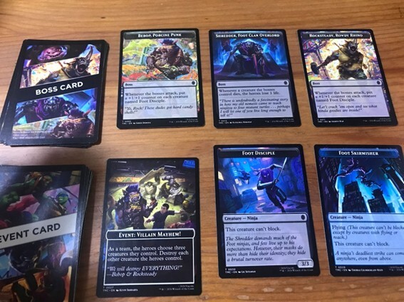 ボスは最大で3体がプレイヤーの前に立ちはだかる!こんな感じでシュレッダーがビーバップとロックステディを引き連れてタートルズの前に立つなんてことも起こりうるぞ!クールすぎるぜ……キットは英語版しか存在していないが、マジックプレイヤーであればわかる言葉で書かれているので問題ないはず。というか今の時代、簡単にスマートフォンなんかで翻訳できるしなぁ。そんなわけで英語版しかないからと敬遠せずに、皆で卓を囲んでワイワイと盛り上がっていただきたい。仲間と協力して戦う、マジックにはそんなクールな遊び方だってあるんだ!