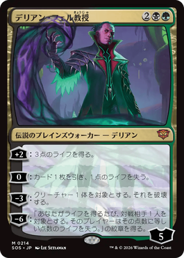 《デリアン・フェル教授》!久しぶりにプレビュー段階で話題を集めたプレインズウォーカー・カードの登場だ。黒と緑を司るウィザーブルーム大学の偏屈教授であるキャラクターだ。この新登場のプレインズウォーカーは4マナで忠誠度5でスタート、4つの能力を持っている。
